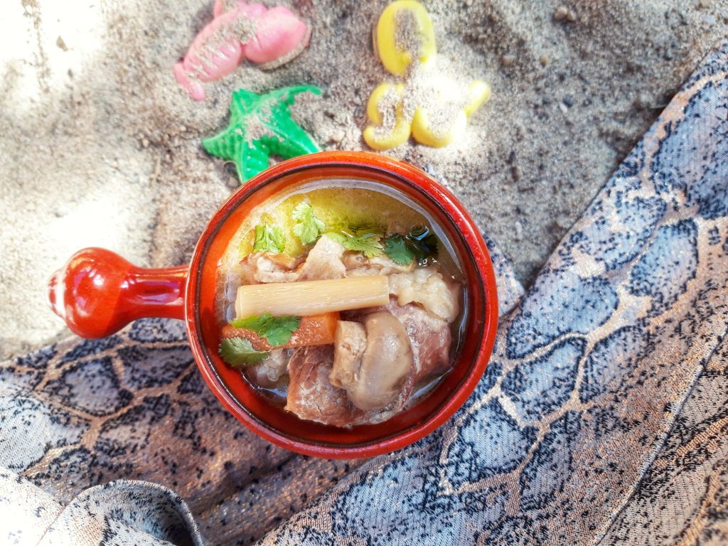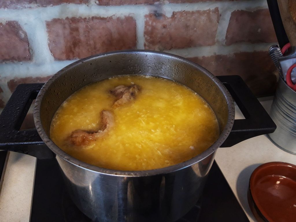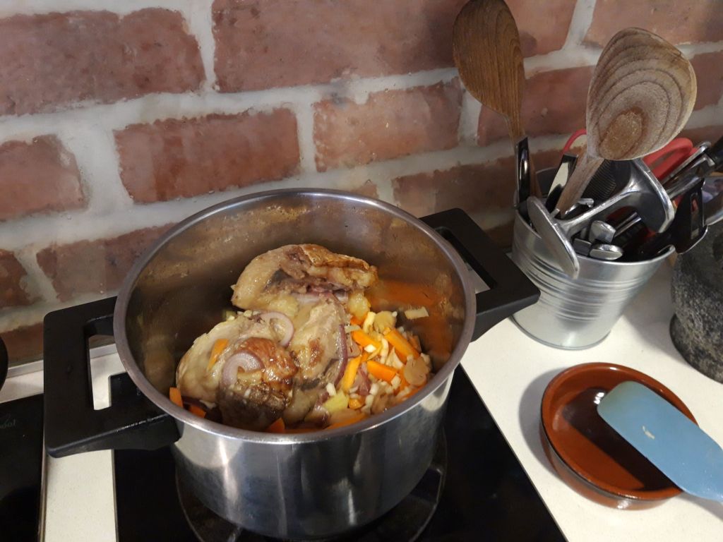 Rumenim puiul in uleiul incins pe toate partile (e mai gustos si nu mai e nevoie sa luam spuma dupa). Adaugam apoi ceapa si ghimbirul, dupa 1-2 minute morcovii, pastarnacul/telina taiate fasii sau cuburi (cum va e mai usor), lemon grass-ul, ciupercile, le amestecam 1-2 minute.