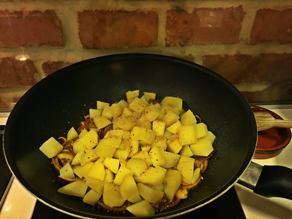 Când ceapa s-a îngălbenit un pic, punem cartofii tăiați cuburi și amestecăm până se combină cu toate mirodeniile și ceapa se înmoaie.