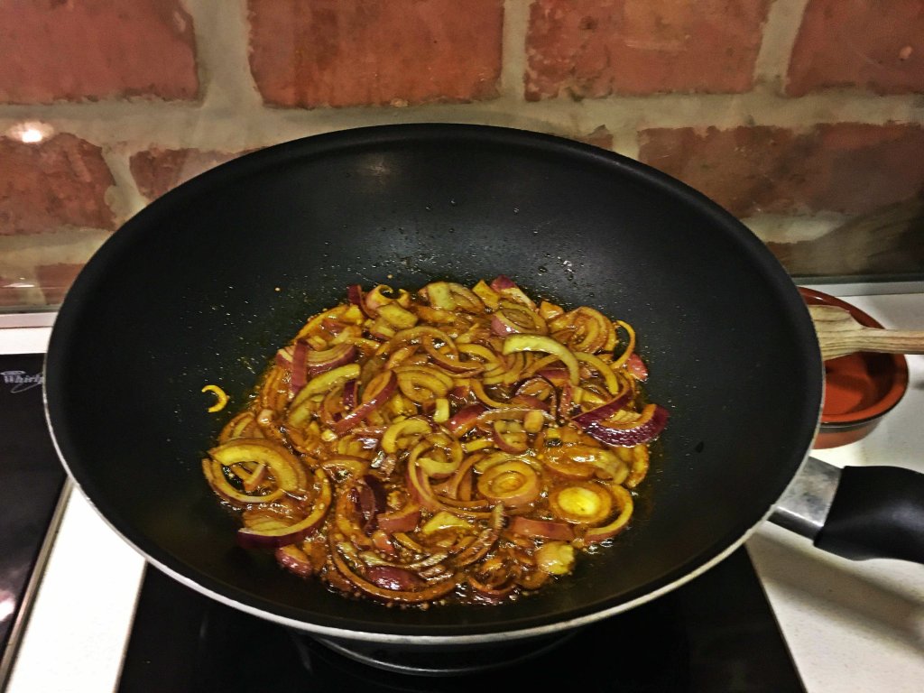 Într-o tigaie cu ulei încins punem turmericul, chimionul, paprika și boabele de muștar. Când boabele de muștar încep să sară (în cîteva secunde), adăugăm ceapa tăiată rondele. În multe zone din India condimentele se prăjesc la început pentru a elibera uleiurile conținute și pentru un plus de gust.