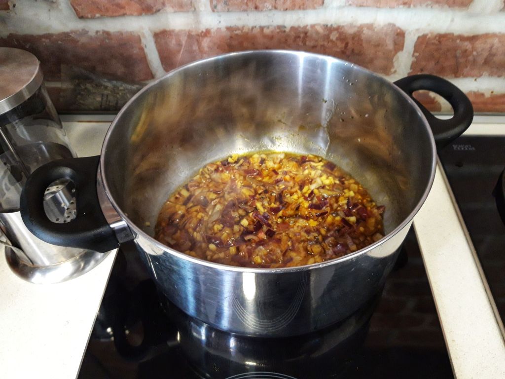 Incingem uleiul intr-o cratita si calim ceapa si condimentele 1-2 minute, dupa adaugam usturoiul maruntit/ pisat si ghimbirul taiat mic sau dat prin razatoare, cum va e mai usor. Lasam 1-2 minute.