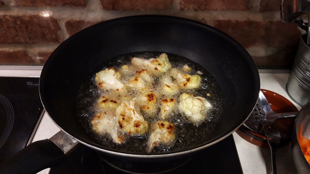 Spălăm conopida și o rupem în buchete mici, cât de cât egale. O scurgem bine și o punem la prăjit în uleiul încins.