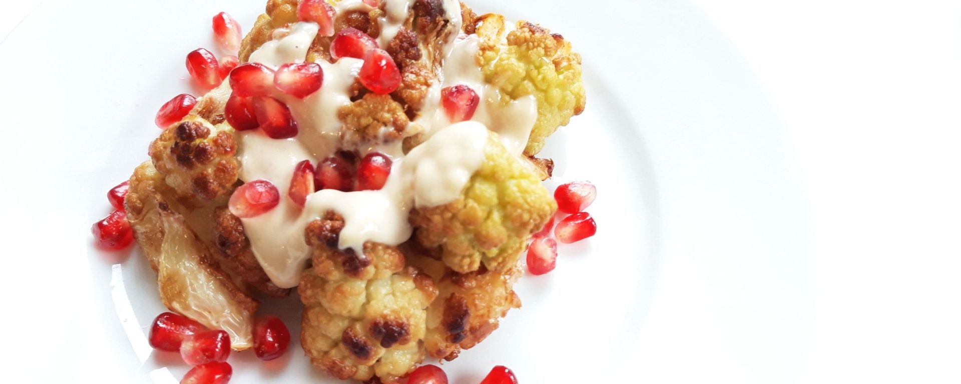 Când conopida e gata (eu gust să mă asigur că e pătrunsă, ceea ce vă sfătuiesc și pe voi), punem peste ea fulgii de migdale daca ati optat pentru ei, sosul tahini și boabele de rodie sau sucul de rodie, în funcție de ce avem prin casă. Poftă bună! 🙂
