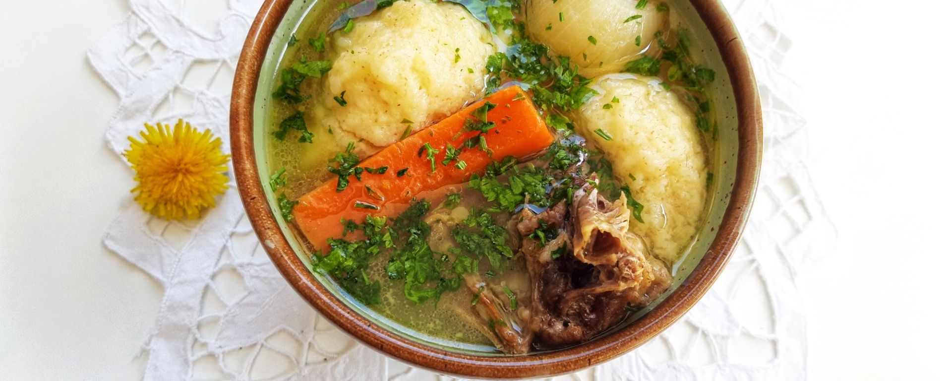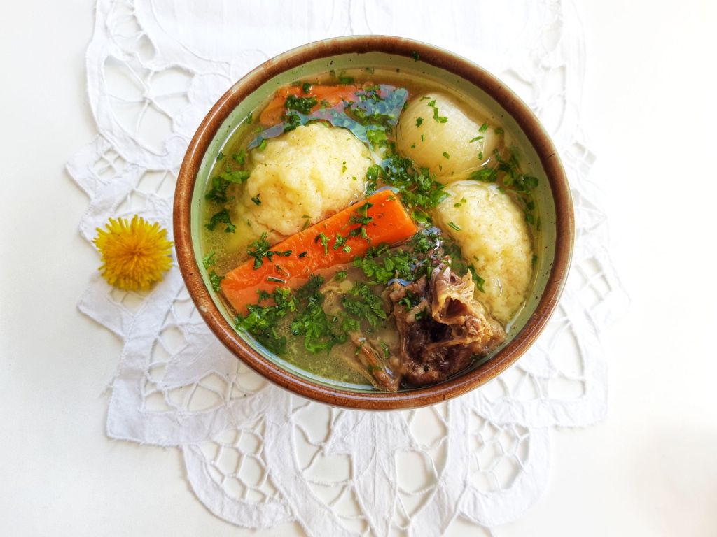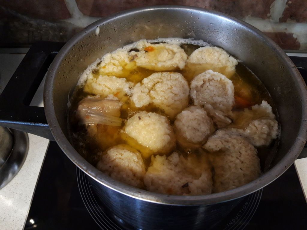 Cand carnea si legumele au fiert (le gustam sau „le incercam” cu o furculita), punem galustele una cate una: cam un sfert de lingura de ciorba pentru fiecare galusca.