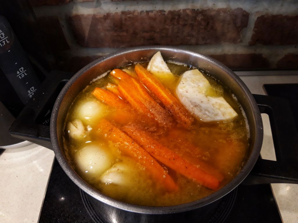 Cand am terminat cu spuma punem morcovii, telina, pastarnacul (eu le tai in doua), ceapa intreaga si usturoiul pisat.