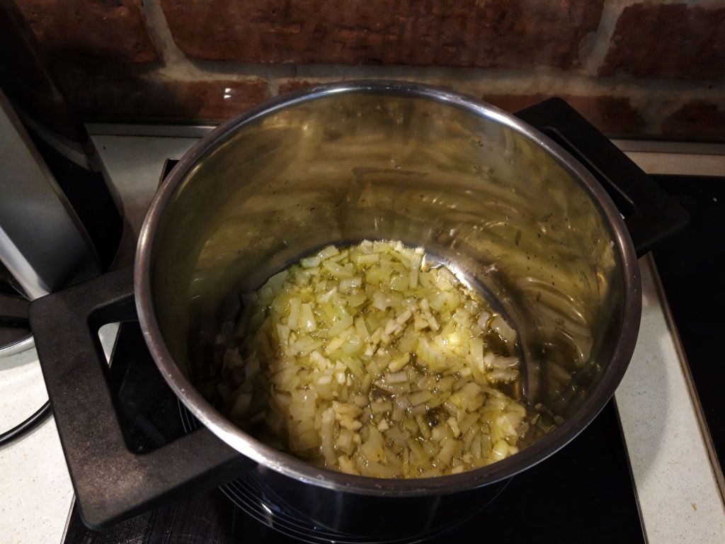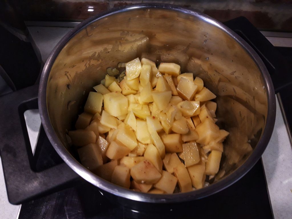Intr-o oala cu ulei încins punem 2 minute ceapa la calit, apoi usturoiul si cartofii taiati cuburi.