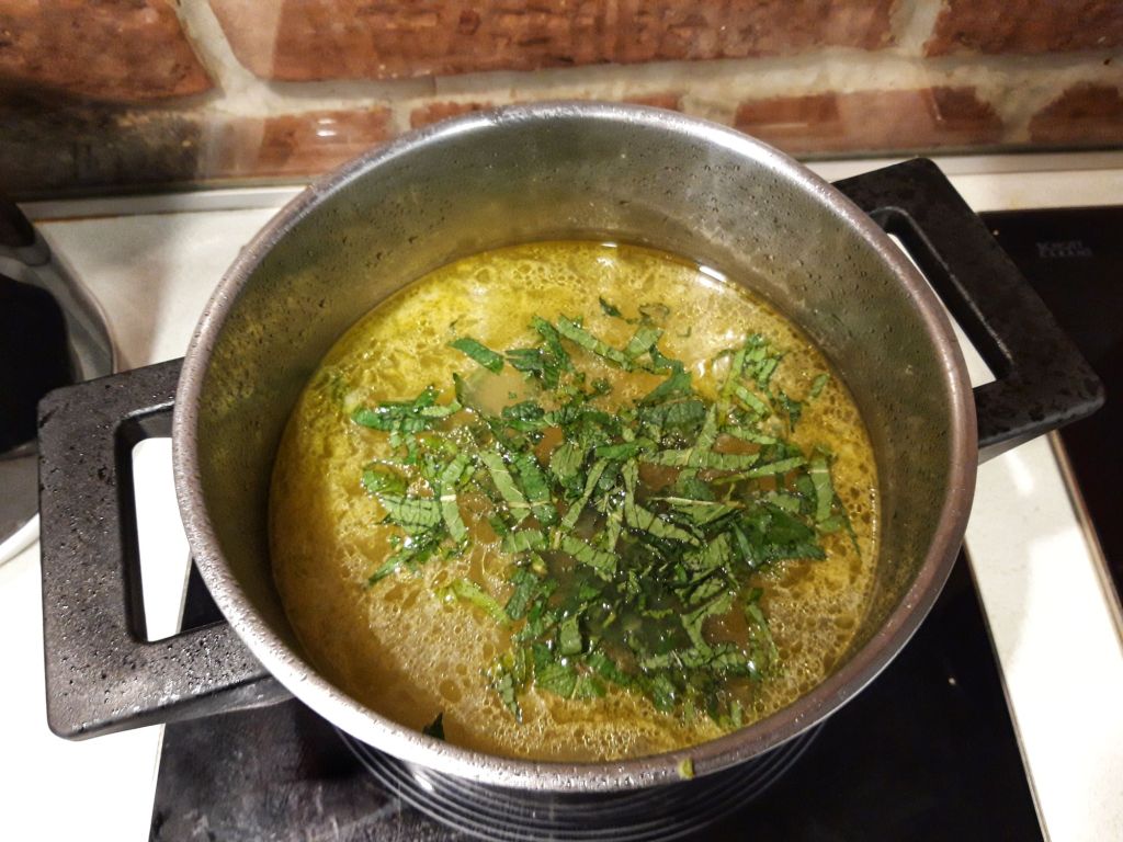 Cand cartofii au fiert, gust sa vad daca mai e nevoie de sare, adaug menta taiata, smantana, daca ati optat pentru ea (supa e foarte gustoasa si fara) si dau prin blender.