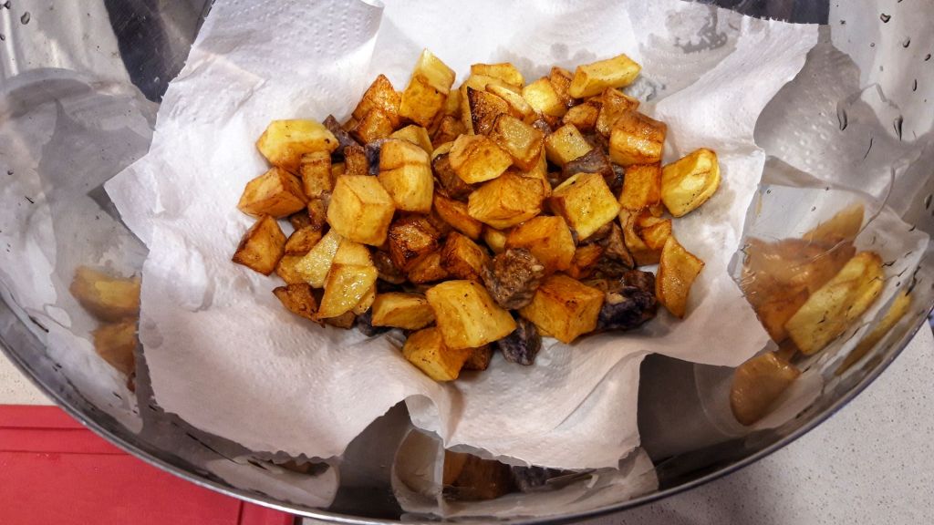 Scoatem cartofii, ii scurgem de ulei si ii punem pe un servet de hartie sa se mai duca din ulei.