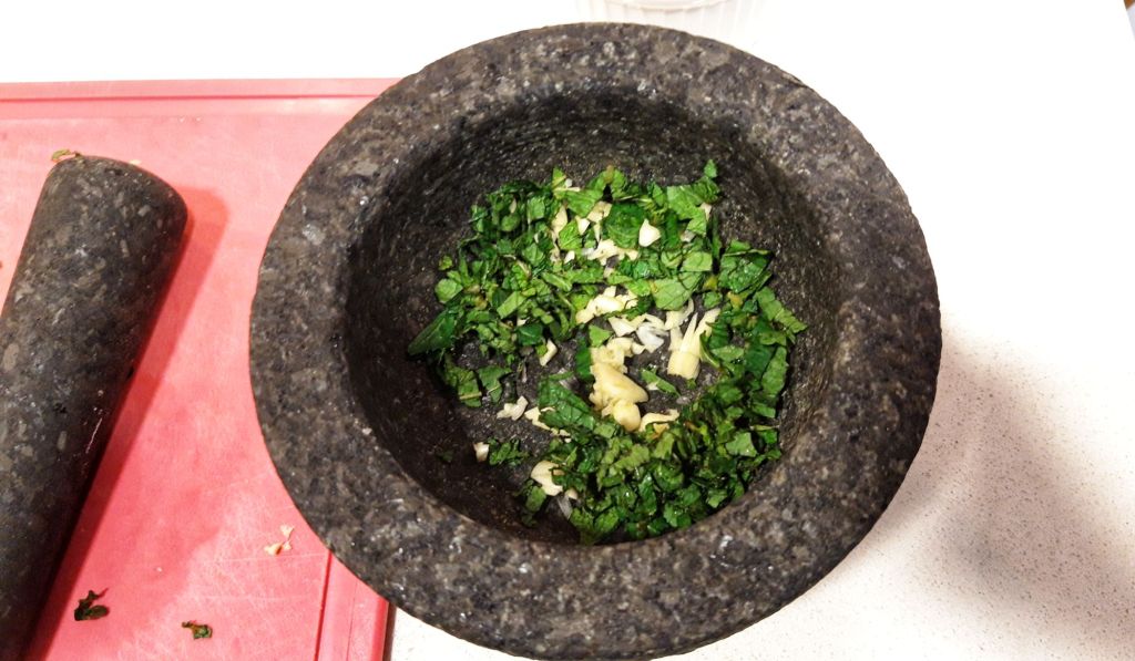 Puteti presara menta taiata marunt direct pe cartofi, eu nu m-am putut abtine ca menta si usturoiul fac super pereche si le-am amestecat un pic in mojar sa eliberez aromele.