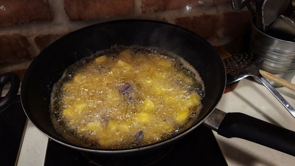 Curatam cartofii, i-am taiat cuburi mici si i-am lasat intr-un vas cu apa rece pana ce s-a incins uleiul.