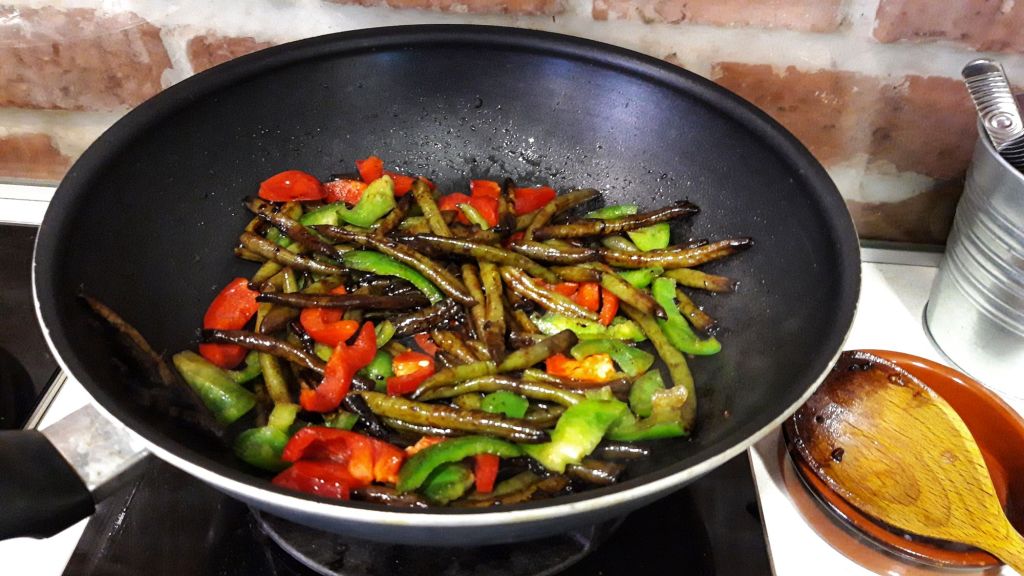 E o rețetă simplă, rapidă, o mâncare gustoasă dar nesofisticată, bogată în fibre. Ideal de pregătit atat iarna, în grabă, cu fasole din conserva sau vara cu fasole proaspata. Cu un orez lângă și o salată de legume crude, puteți pregăti repede o cină gustoasă și consistentă, inspirată din bucătăria chinezească.