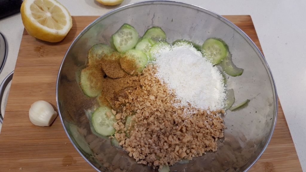 Din categoria gustarilor rapide si a salatelor care pot inlocui cu succes o masa, inspirata din chutney-ul indian Khanang Kakadi, doamenlor si domnilor, va prezint o minunata salata de castravete cu arahide si cocos!