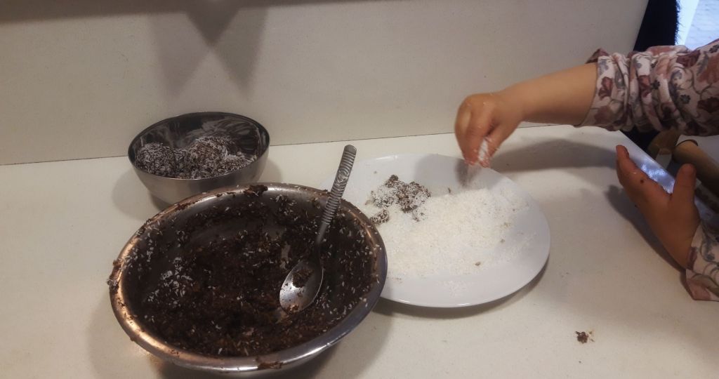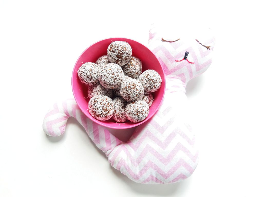 Si-acum distractia: amestecam toate ingredientele pana ce obtinem o pasta omogena care poate fi transformata in bile. Daca e prea tare, mai completam cu un pic din apa in care s-au inmuiat curmalele, daca e prea moale, mai punem faina de migdale (sau fulgi de ovaz pisati). Gustam si completam cu miere, cocos, dupa caz si formam bombonelele.