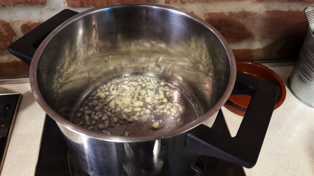 Intr-o oala incingem uleiul si calim 1 minut usturoiul maruntit. Adaugam laptele batut si un pic de apa.