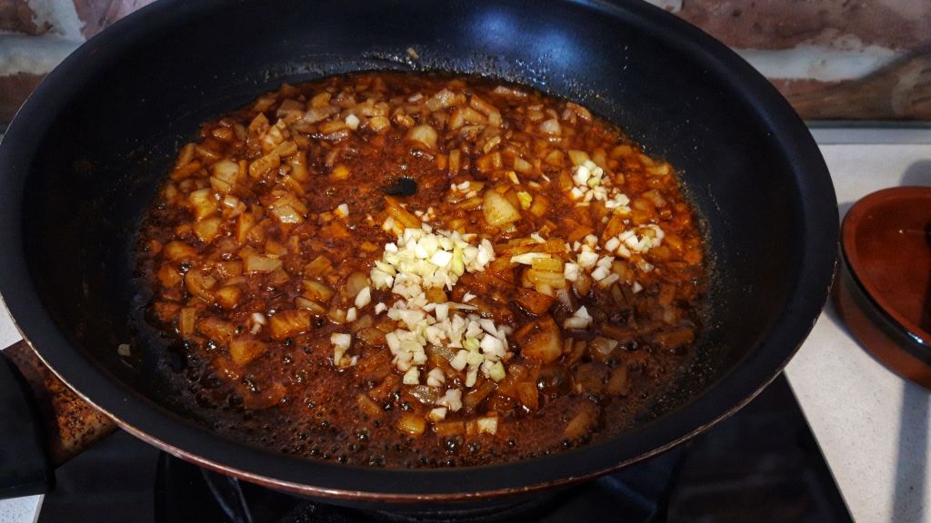 Adaugam usturoiul maruntit, il lasam 1 minut, apoi completam cu pasta de tomate si juma’ de pahar de apa sau rosiile in bulion, sare, piper, mierea si otetul.