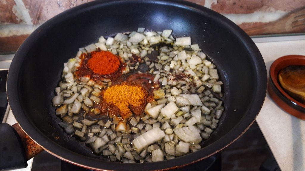 Tocam marunt ceapa si o calim 2-3 minute in ulei incins, impreuna cu condimentele.