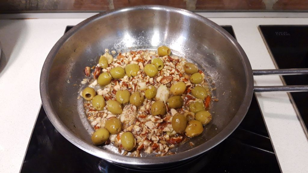In uleiul incins calim 1-2 minute cateii de usturoi intregi, apoi adaugam chimionul si feniculul seminte (le pisez un pic in mojar inainte), amestecam si adaugam maslinele si migdalele (eu le maruntesc pe motiv de copil mic, le puteti lasa intregi).