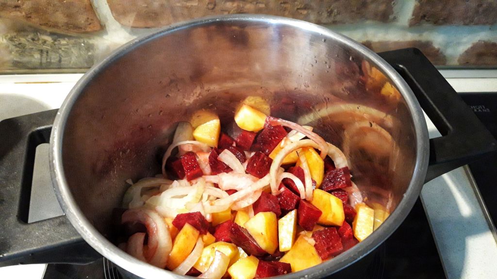 Incingem uleiul intr-o oala, punem ceapa si chimionul 1-2 minute sa se caleasca usor, apoi adaugam usturoiul, sfecla si cartofii taiati, amestecam 1 minut si completam cu apa.