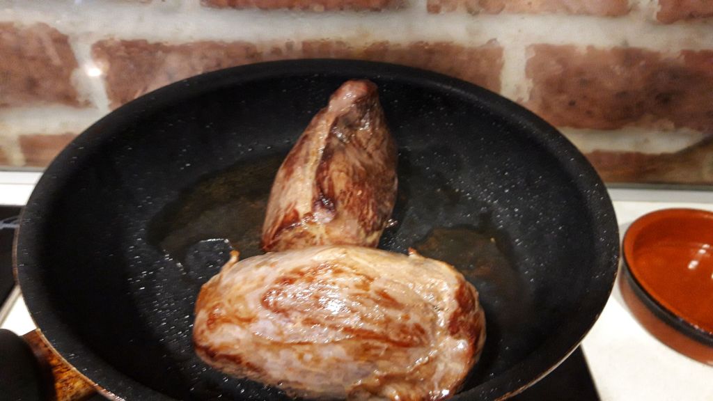 Prajim carnea in tigaie, cu o lingura de ulei incins, pe toate partile, pentru a obtine o crusta maronie, asta e reactia Maillard.;)