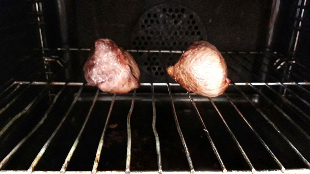 Bagam friptura la cuptorul preincalzit, la 110 grade, 40 minute pt medium rare sau 50 minute pt medium done. Tineti minte, lichidul rosiatic de la medium rare e apa cu o proteina din carne, nu are legatura cu sangele, asa cum credeam;)