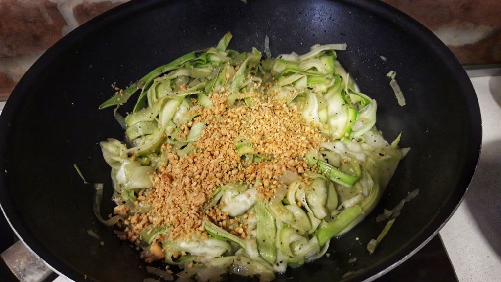 Am adaugat dovleceii, o mana de arahide pisate (sau parmezan), sare, piper si am lasat 10 minute la foc mediu pana au fost gata. Noua ne plac mai al dente. Gustati si stabiliti cand sunt facuti.