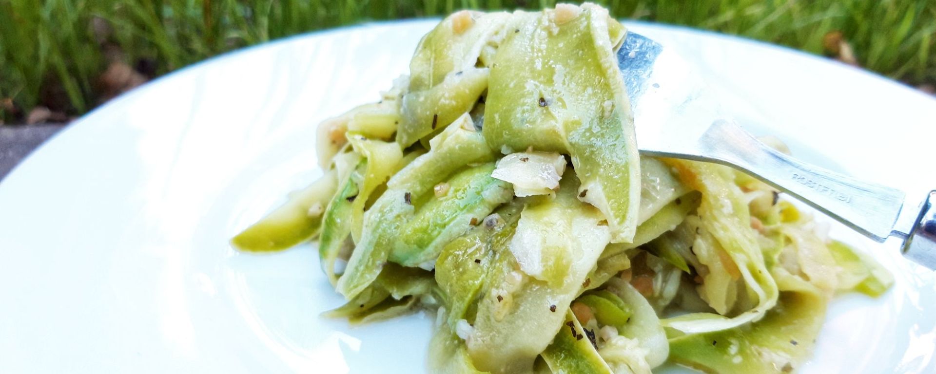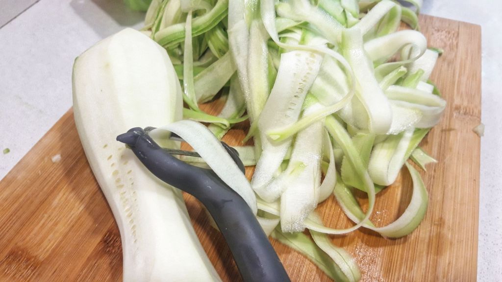 Singura parte complicata a retetei de paste de dovlecei este taierea lor, restul e gata in 10 minute! Am optat pentru varianta la indemana, dar mai lunga si am taiat fasiile de dovlecei cu peelerul de bucatarie. E mai rapid daca aveti un robot de bucatarie;)