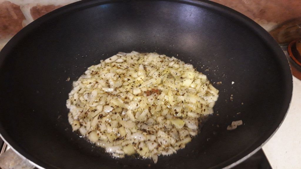 Intr-o tigaie cu ulei incins am calit 1 minut ceapa, busuiocul si usturoiul pisat.