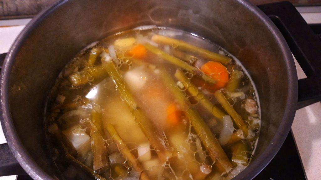 Cand legumele si-au schimbat un pic culoarea, adaugam sare, piper, apa, cartofii si lasam sa fiarba.