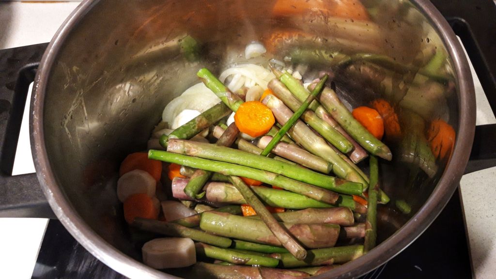 Intr-o oala cu ulei incins calim 1 minut ceapa, apoi usturoiul, morcovii, pastarnacul rondele si cozile de sparanghel.