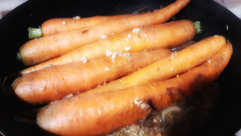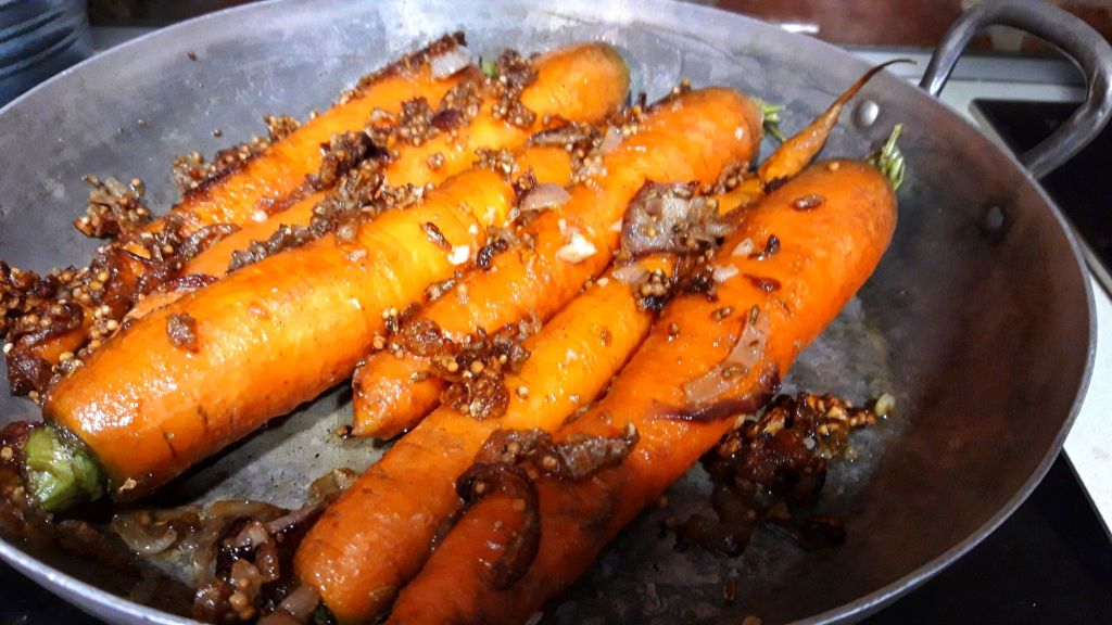 Morcovii se prăjesc întâi cu ceapa, usturoiul, ghimbirul și condimentele, apoi se dau la cuptor și se servesc cu tahini.