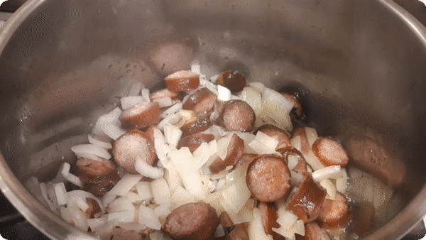 1. Calim 4-5 min carnatii sau afumatura, apoi adaugam ceapa tocata, amestecam si o lasam 1-2 min.
