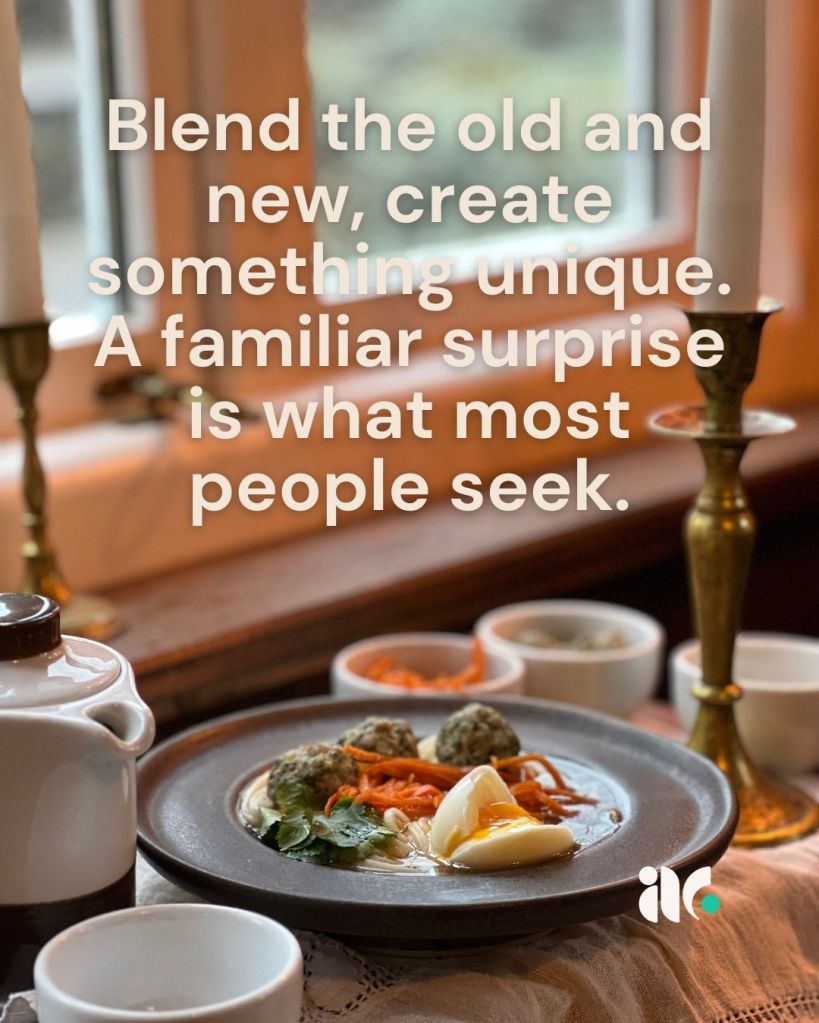 - „Blend the old and new, create something unique. A familiar surprise is what most people seek.”