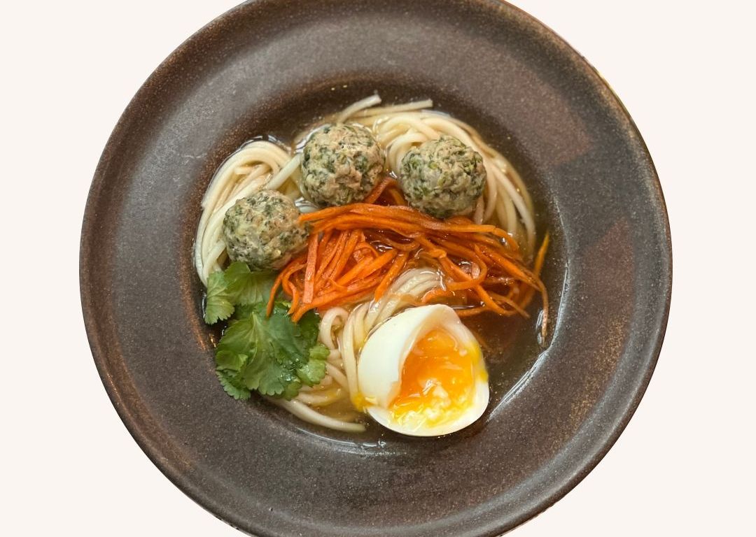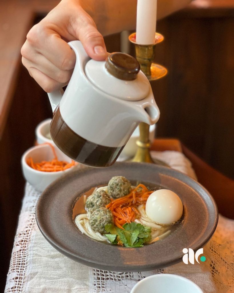 Inspired by Chef Jonas Schaefer, I decided to blend the familiar comfort of „ciorba de perisoare” with the exotic allure of pho spices. This led to the creation of „My Transylvanian Ramen,” a fusion dish featuring slow-cooked beef bone broth, Romanian meatballs, noodles, a boiled egg, coriander, and seasonal veggies. Chef Jonas’s suggestion to serve the broth from a teapot added a theatrical element, enhancing the dining experience. The result was a rich, flavourful dish that appealed to both traditionalists and adventurous eaters.